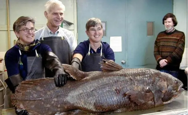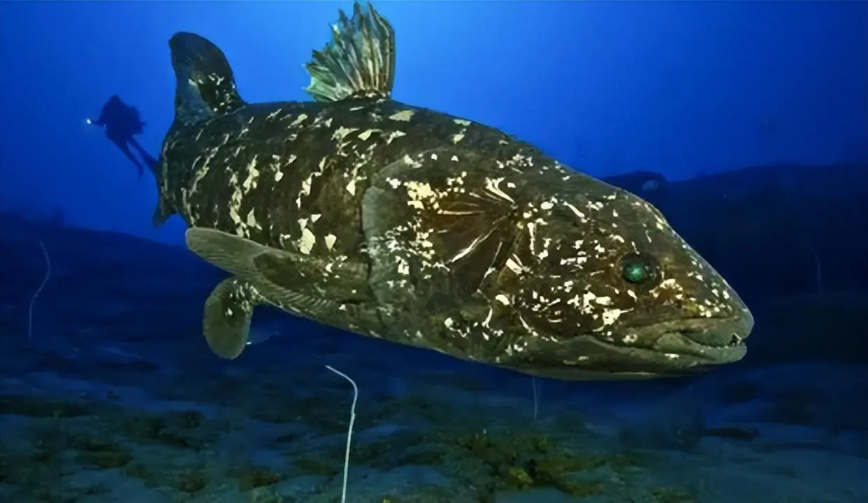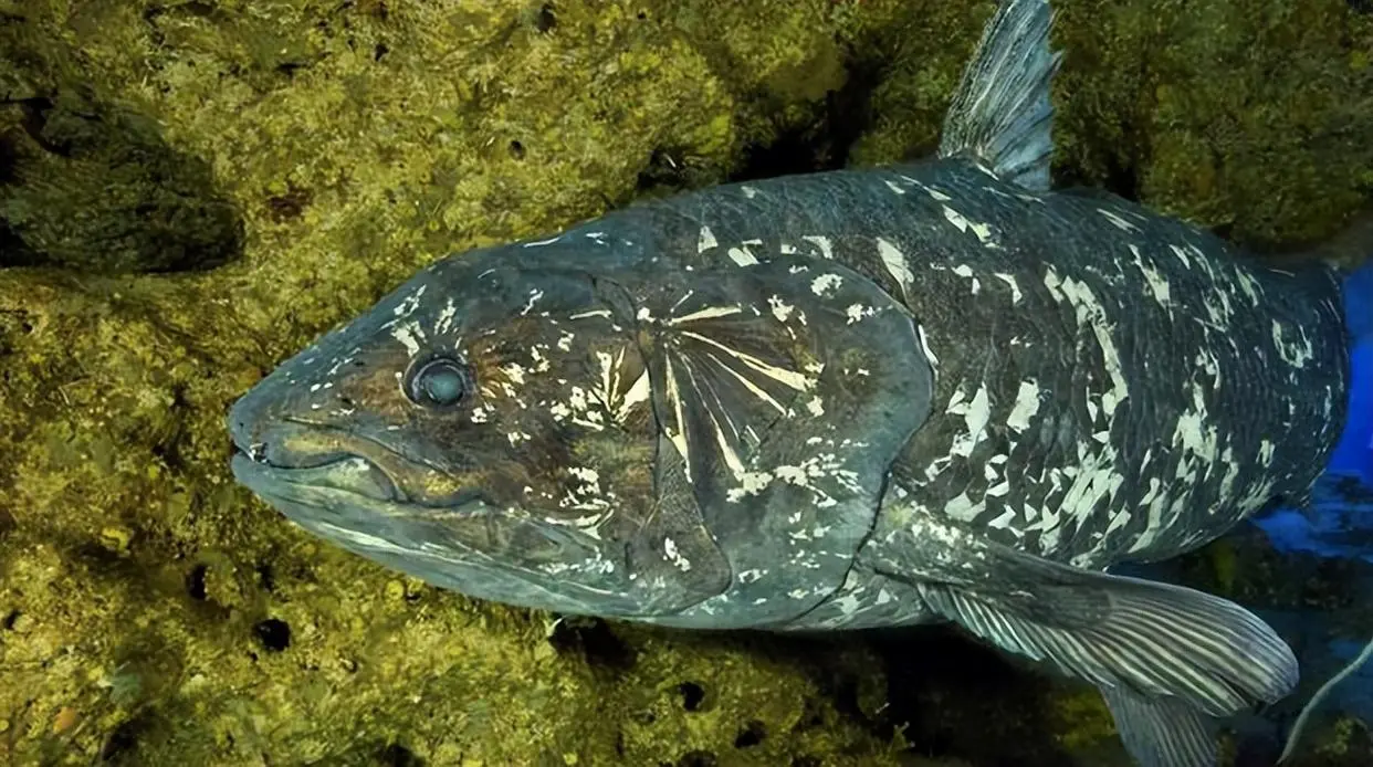 第三种:腔棘鱼在史前动物的“辈分”排序中,生存史长达4亿年的腔棘鱼绝对占据重要地位。腔棘鱼属于腔棘目叶鳍硬骨鱼类,身形呈纺锤形,成年个体体长约1.5米。它的全身覆盖着极厚的鳞片,鳞片上还带有尖锐的小刺,这便是腔棘鱼抵御天敌的天然保护机制。
